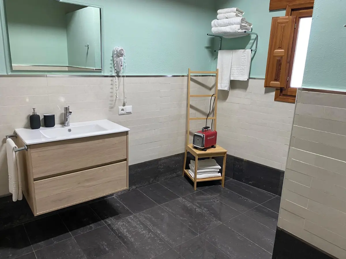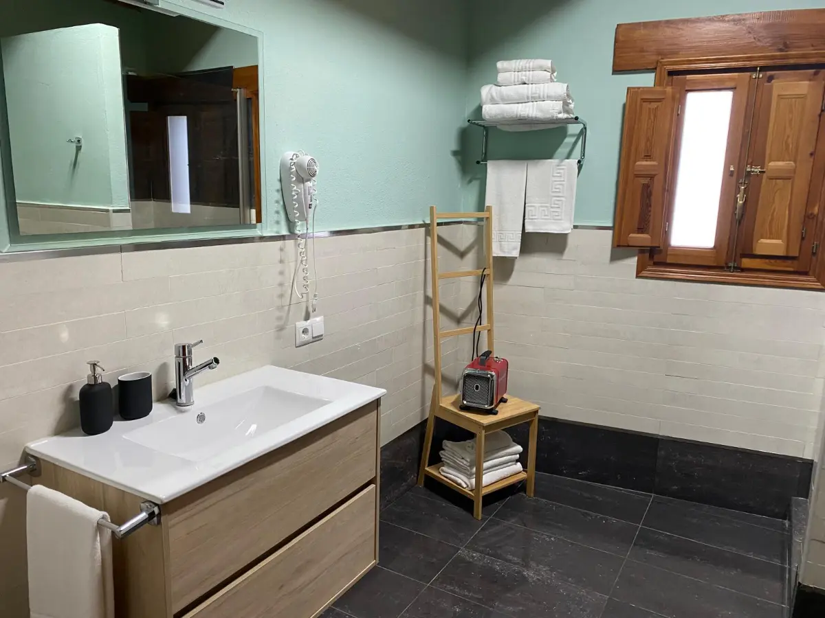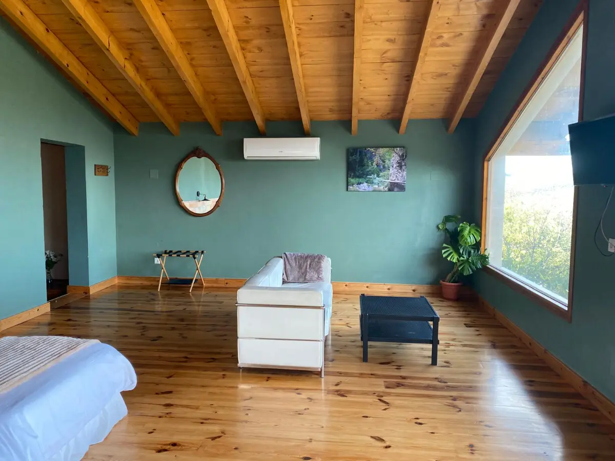 Sus grandes ventanales inundan la estancia de luz y ofrecen vistas abiertas al entorno agrícola y montañoso del Matarraña, reforzando la sensación de desconexión y tranquilidad.